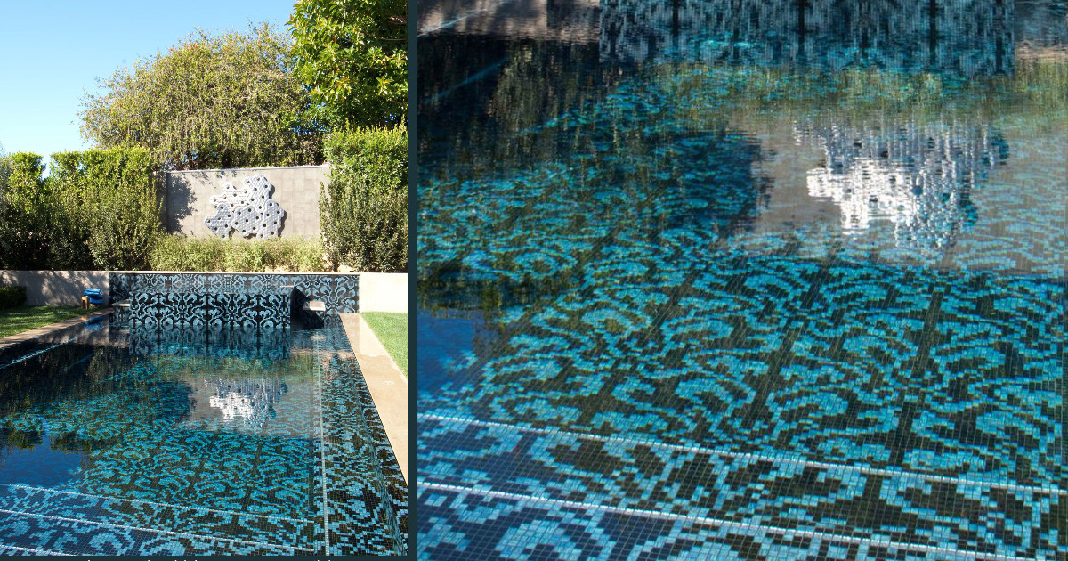 A mozaikba rajzolt minták azonnal magukba szippantják a tekintetet. A fekete és a különböző kék árnyalatokból kirajzolódó ornamentika egyszerre idézi meg a keleti szőnyegek gazdagságát és a kortárs design kifinomultságát. Minden apró részlet aprólékos tervezésről árulkodik: a minták ritmusa, a színek harmóniája és a víz tükrének folyamatos mozgása újra és újra életre kelti az egész kompozíciót.